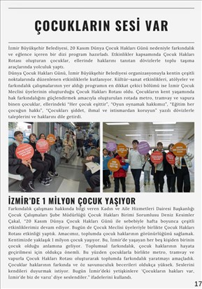Aylık yayımlanan bülten, İzmir’deki her bireyin hizmetlere kolayca ulaşabilmesini sağlamayı amaçlıyor. Kasım sayısında, 25 Kasım Kadına Yönelik Şiddete Karşı Uluslararası Mücadele Günü kapsamında kent genelinde yapılan etkinliklerden 20 Kasım Dünya Çocuk Hakları Günü çalışmalarına; istihdam odaklı eğitimlerden üniversite öğrencilerine yönelik dil kulübü çalışmalarına kadar birçok faaliyete ilişkin haber yer alıyor. Bülten, bu hizmetlere ilişkin farkındalığı ve katılımı artırmayı hedefliyor.